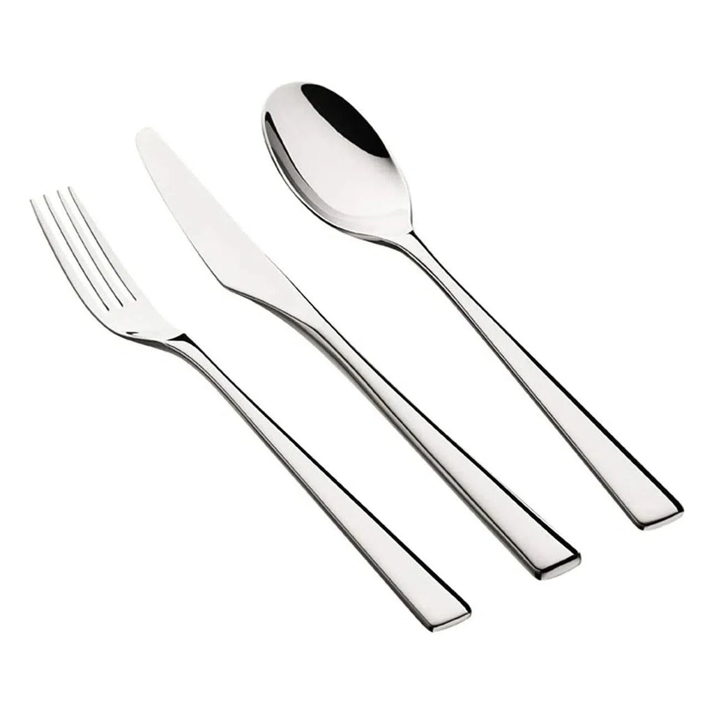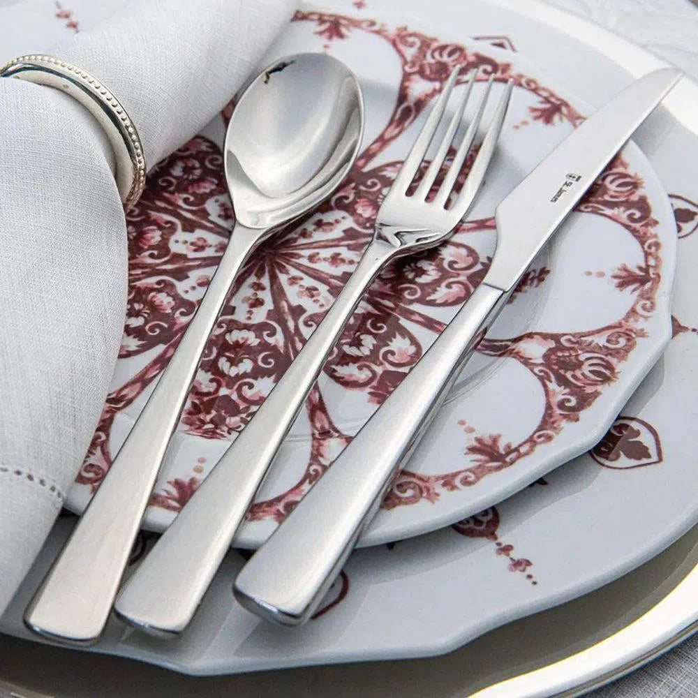 Produzido em aço inoxidável 18/10, com 4mm de espessura, as peças possuem design marcante e acabamento luxuoso, dando um toque a mais de classe e requinte à sua mesa. As facas possuem lâminas temperadas, que mantêm o corte por mais tempo e não causam riscos nas superfícies dos pratos, conservando-os.